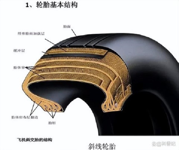 而觀察輪胎內部,則是一層層的構造。由內到外依次是胎唇、胎體簾布、緩沖層、纖維胎面加強層和胎面。